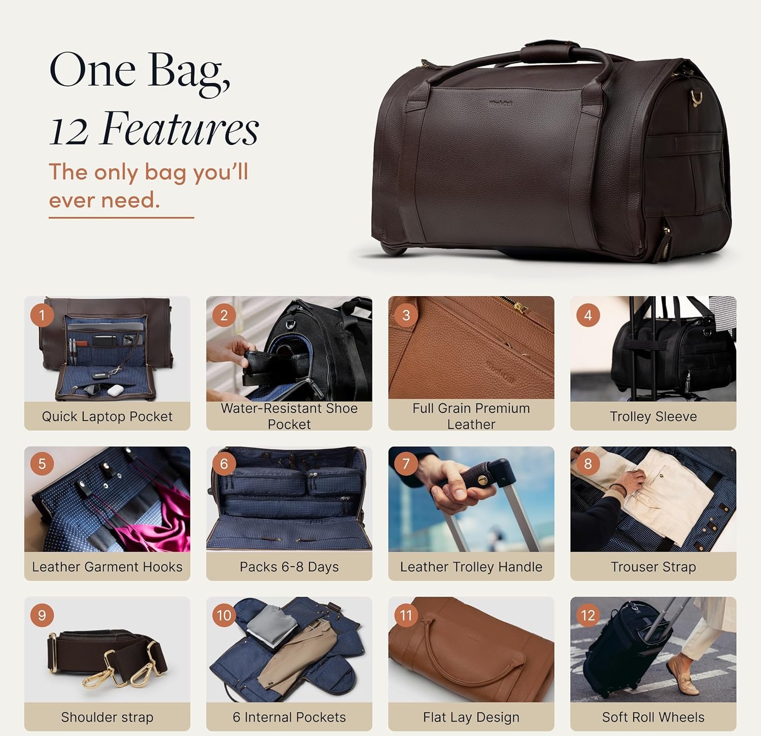 • STYLE MEETS FUNCTIONALITY – Designed for the modern traveler. this duffle bag for travel combines timeless style with smart functionality. With rolling convenience. ample storage. and a built-in garment bag. this carry on bag ensures a seamless travel experience. making it a must-have among travel essentials for women and men.